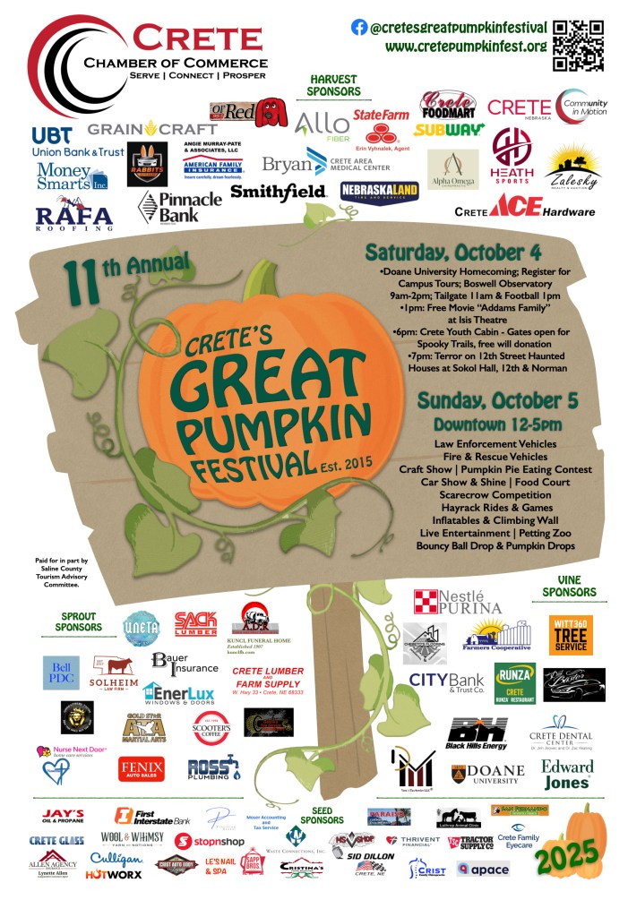 Crete’s Great Pumpkin Festival is hosted by the Crete Chamber of Commerce on the first full weekend of October, with the main event on Sunday from 12-5pm. It will be a day full of entertainment, food, games, and fun for the whole family to enjoy!